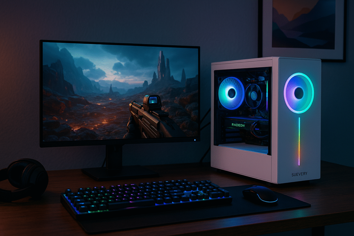 The Suevery Gaming PC is a budget-friendly option designed for gamers who want reliable performance without breaking the bank. It typically comes with a six-core AMD Ryzen processor, integrated Radeon Vega graphics or a dedicated GPU depending on the configuration, and fast SSD storage, making it suitable for everyday gaming, streaming, and multitasking. Its minimalist white case with RGB lighting adds a clean, modern touch to any setup. While it’s not built for ultra-demanding titles at max settings, it delivers smooth performance for most esports and mid-tier games, making it a solid entry-level choice.